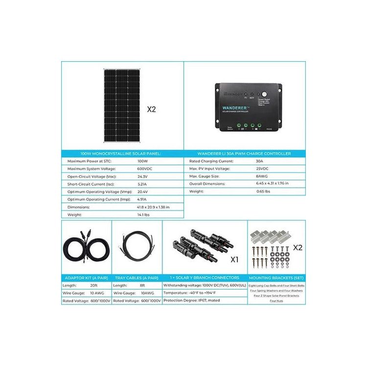 The Renogy 200W 12V Solar Starter Kit is a complete solar power bundle that includes everything you need to start generating and storing off-grid energy. Components are matched for compatibility and optimized performance right out of the box. Ideal for RVs, boats, cabins, and off-grid property installations.